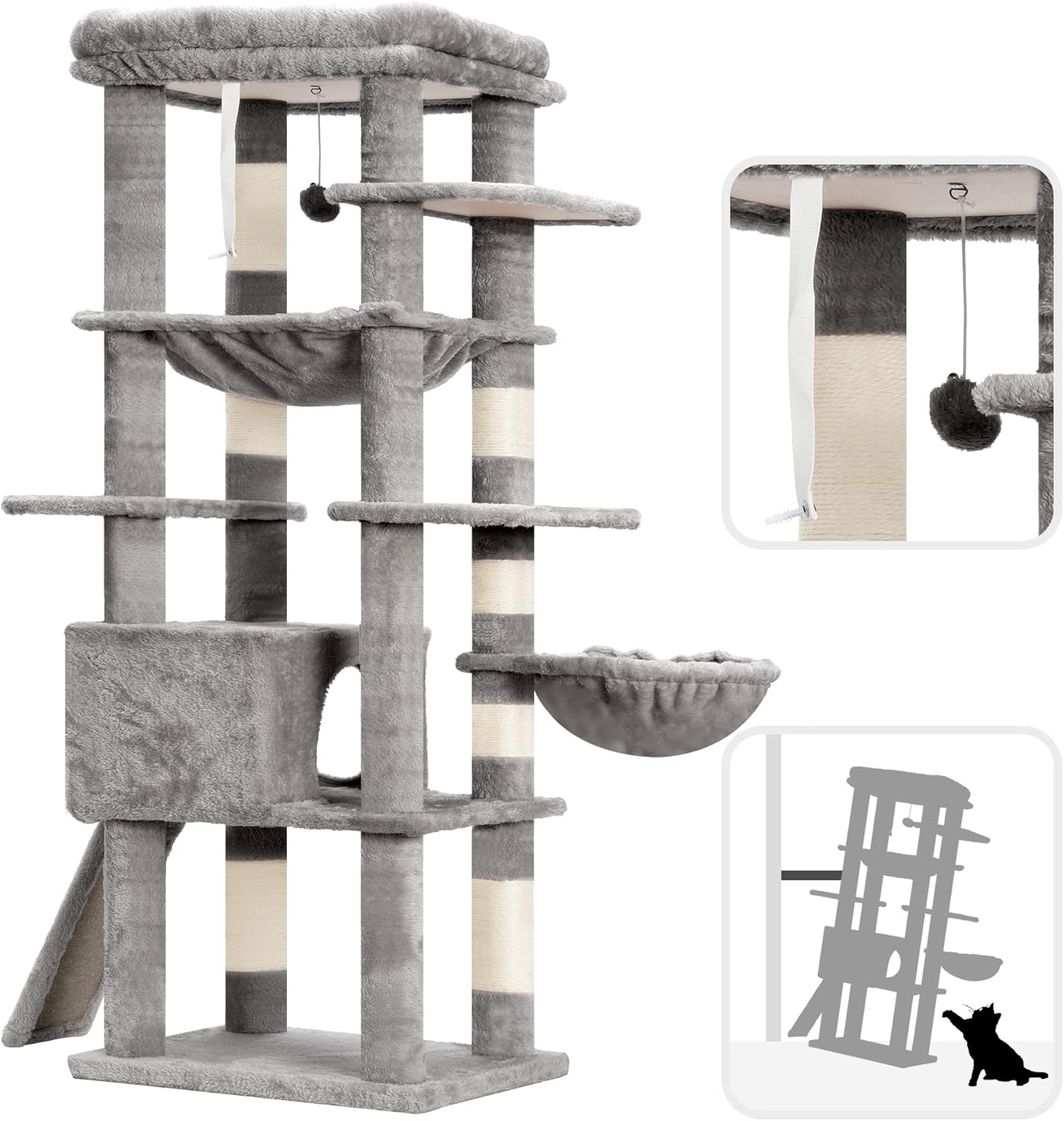 SIMPLE ASSEMBLY: The tall cat tree is equipped with all the hardware and tools. The installation process is straight forward and hassle-free. You can easily follow the instructions provided in the product’s manual for installation