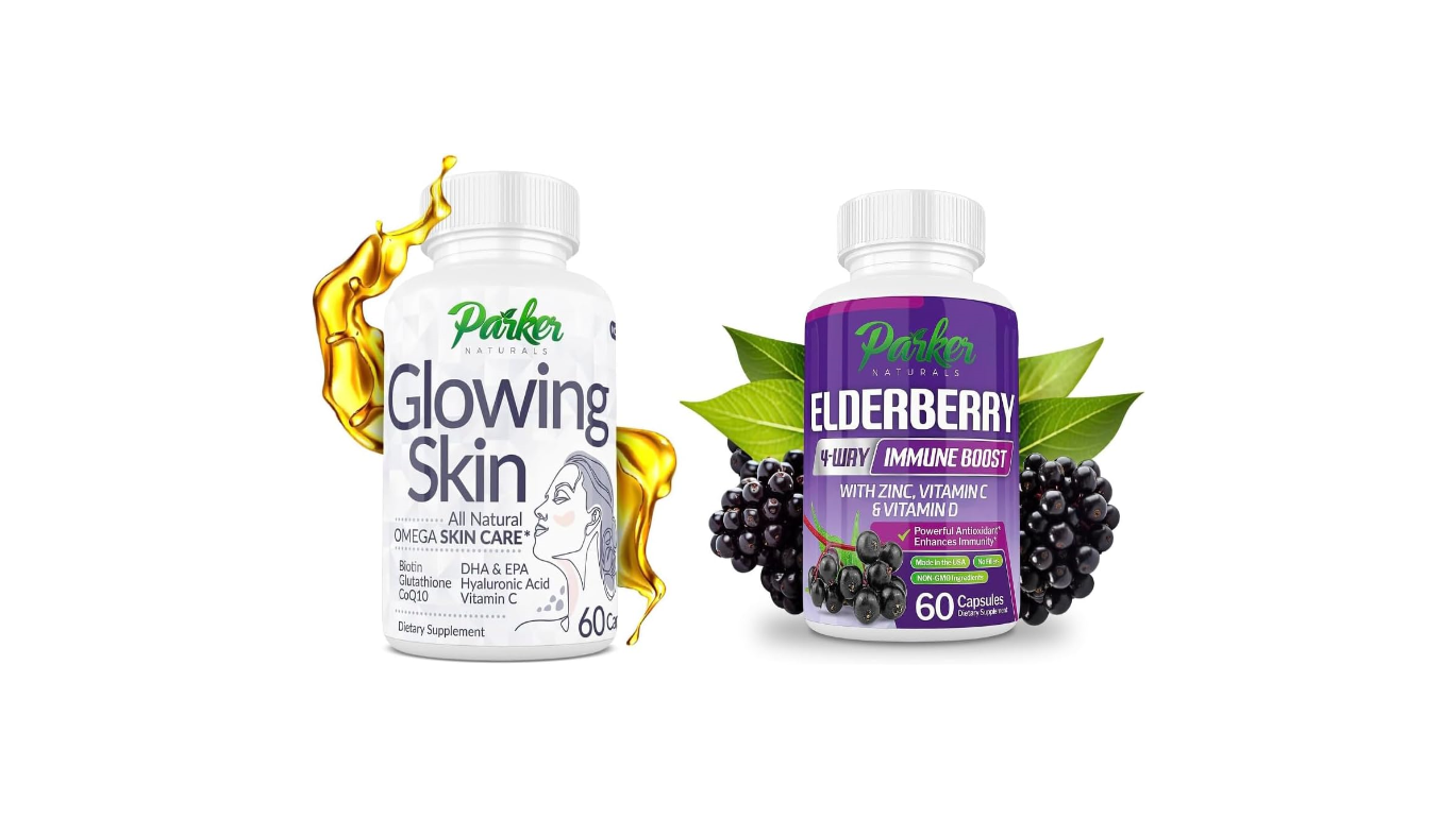 Complete Inside-Out Wellness: Parker Naturals organic elderberry and skin glowing supplements bundle, with DHA/EPA Omega-3 Fish Oil and Vitamin D, supports vibrant skin, a strong immune system, bone health, and overall cellular vitality.